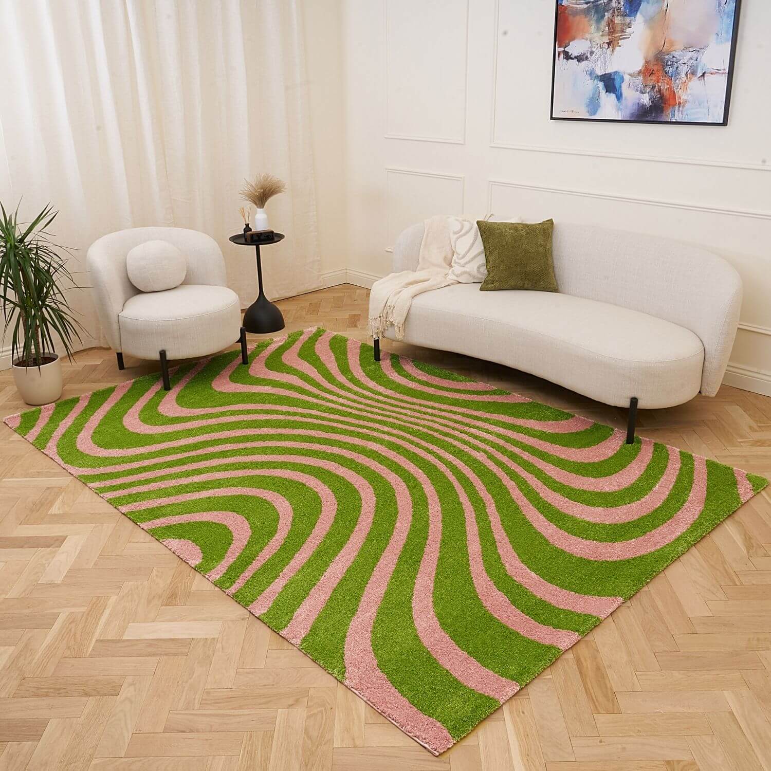 Bring a contemporary twist to your home with the Joli Striped Green & Pink Rug. Its flowing green and pink ripple stripes create a striking visual effect, while the plush pile adds comfort and a sense of depth to your space.