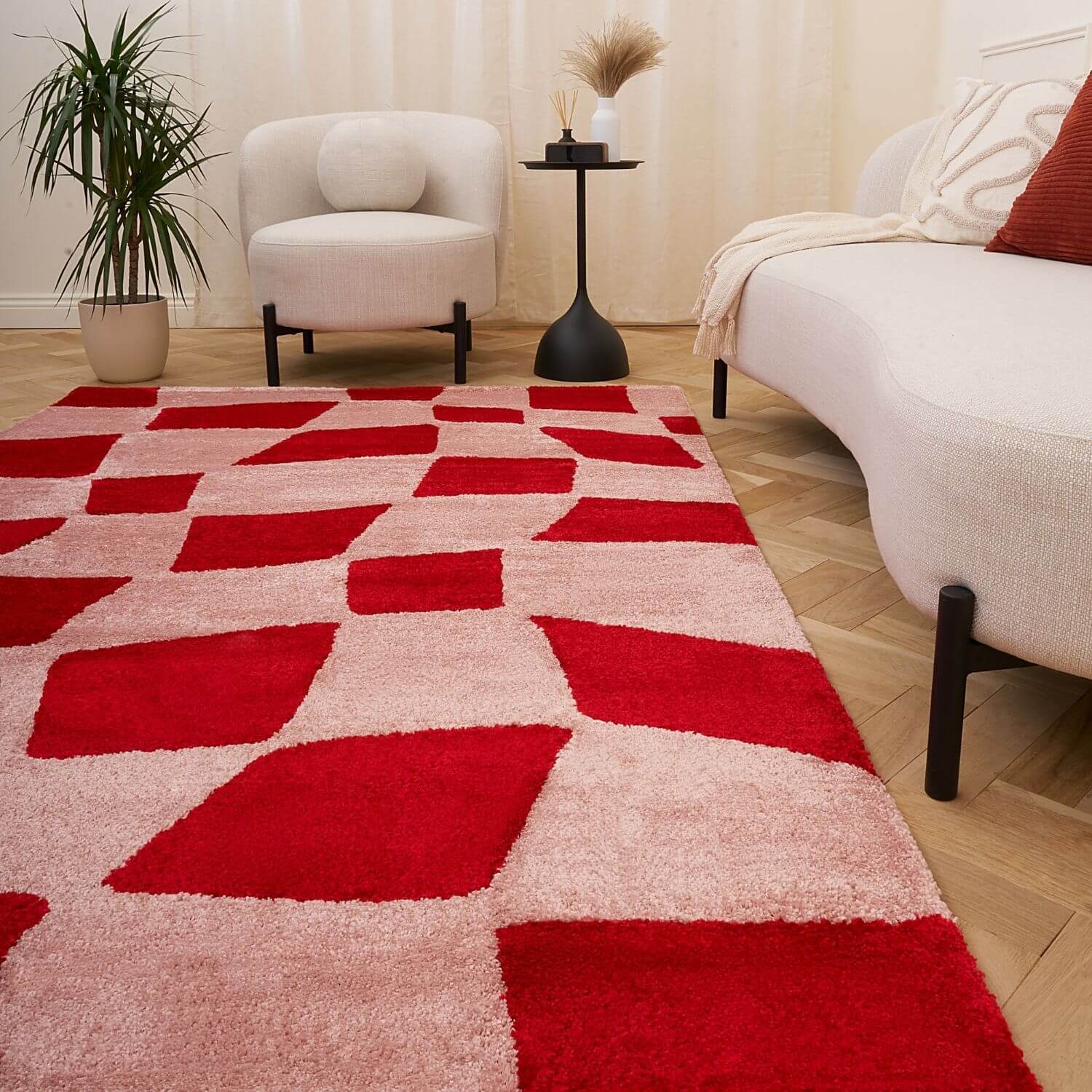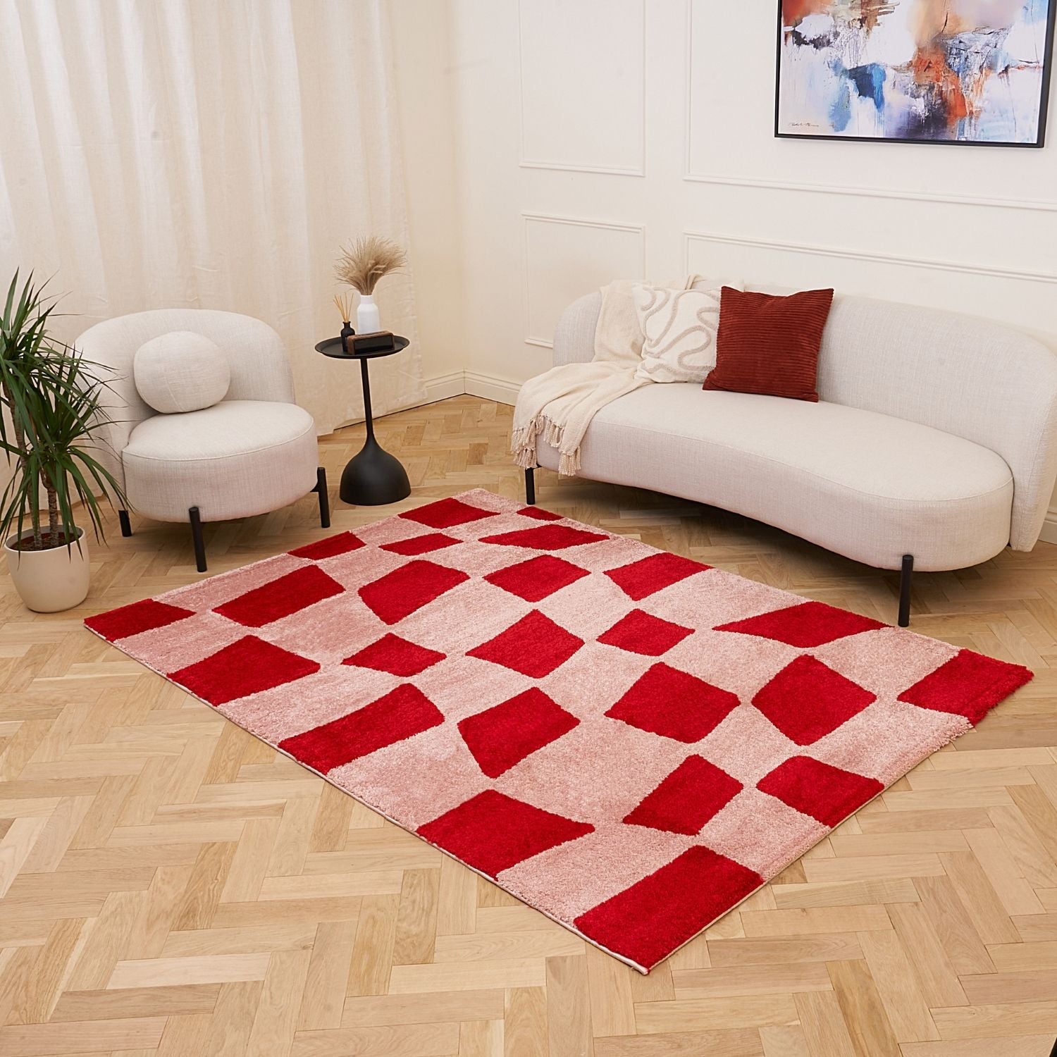 Make a bold statement with the Joli Checkered Red & Pink Rug. Its irregular checker design blends soft, uneven blocks with vibrant colour, giving the rug a contemporary, hand-drawn character that energises any interior.
