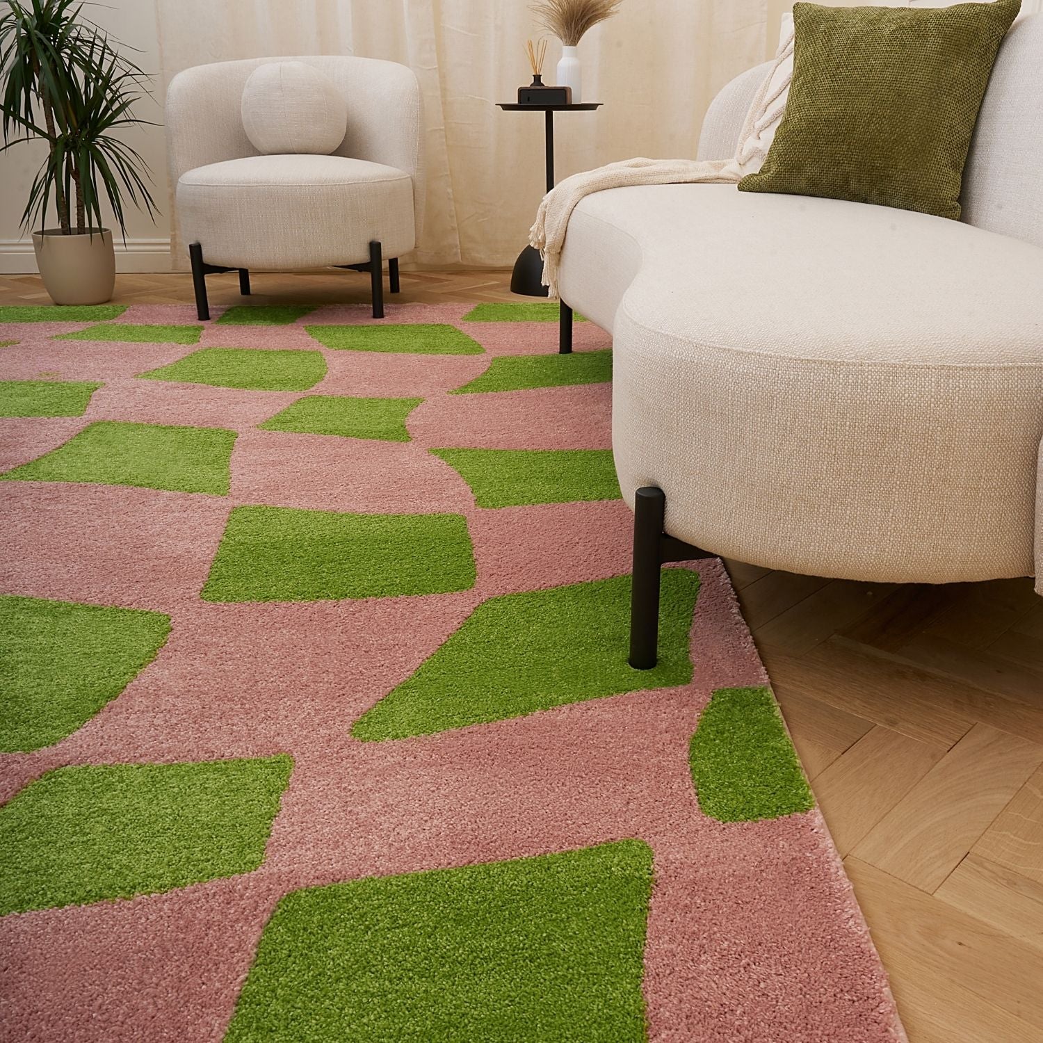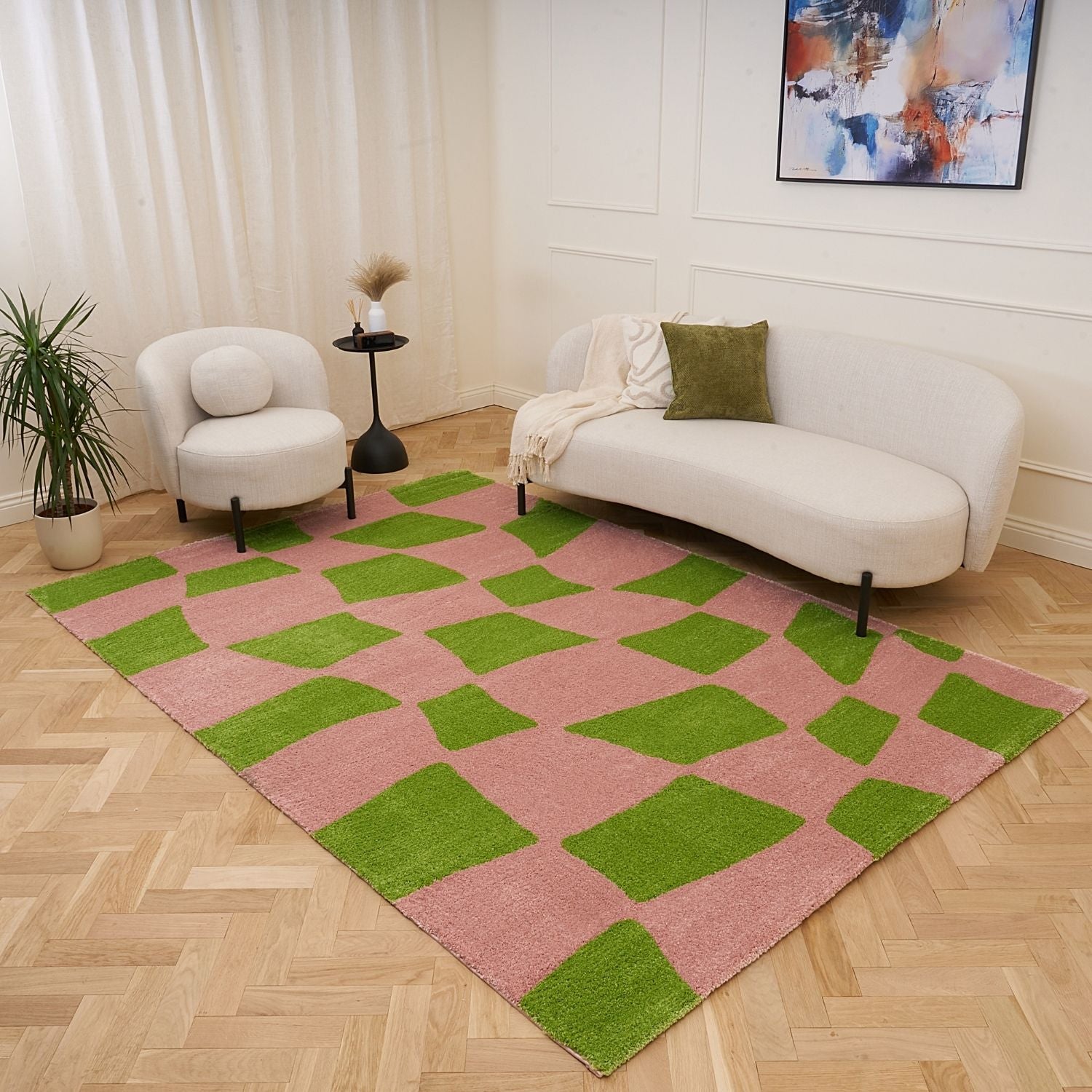 Make a striking statement with the Joli Checkered Green & Pink Rug. Its irregular checker design, featuring soft, uneven blocks, brings an artistic, hand-drawn feel while adding contemporary flair and texture to any room.